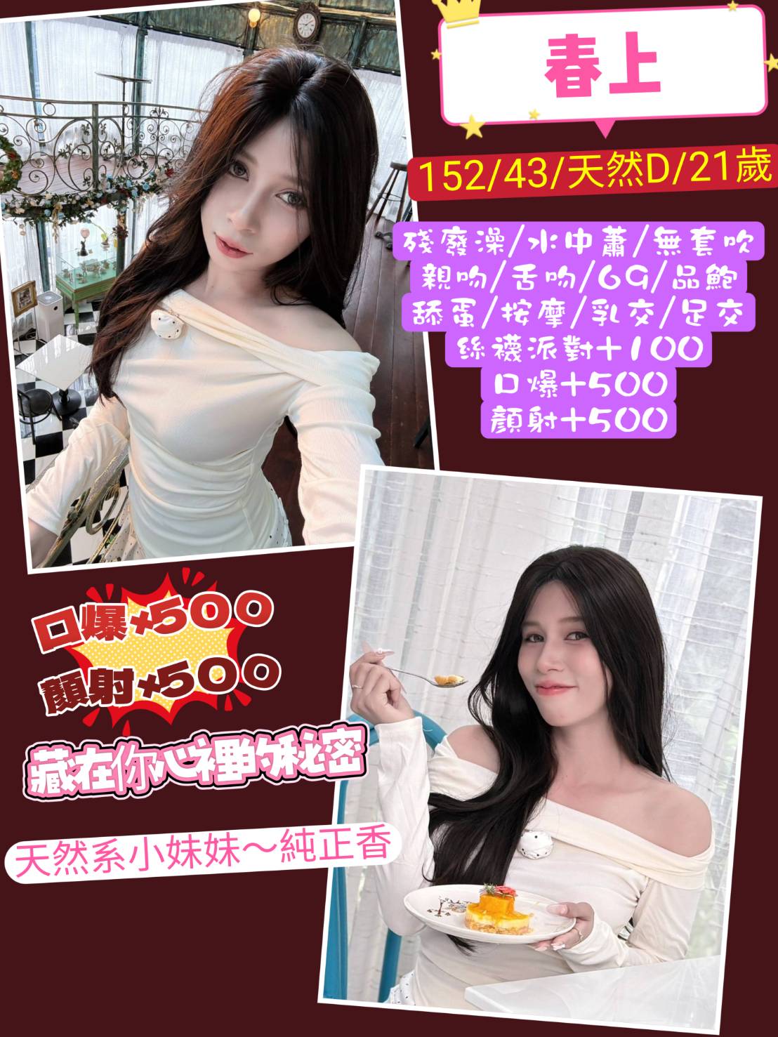 無套吹 戴套做 共浴 親親 舌吻 品鮑 69 按摩 奶炮 舔蛋 胸推 屁推 絲襪